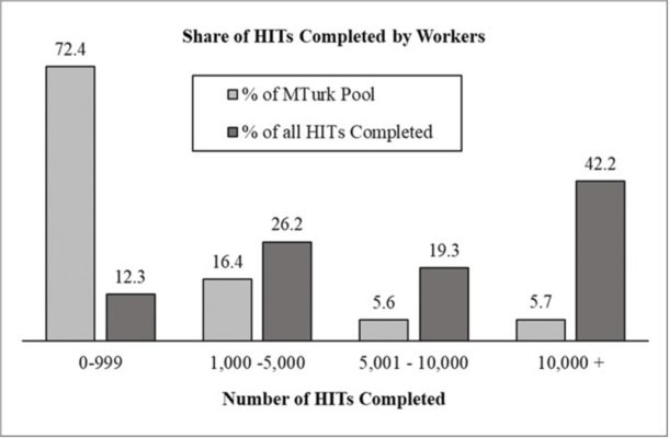 The idea that standard worker qualifications may contribute to the super-worker problem has been entirely overlooked by researchers, in part, because the problem is difficult to see. Most researchers believe that using worker qualifications of a 95% approval rating and at least 100 HITs completed are necessary to maintain data quality. However, these qualifications block around 35% of workers who have less than 100 prior HITs and help skew a study’s sample toward experienced workers who have often completed thousands of HITs.